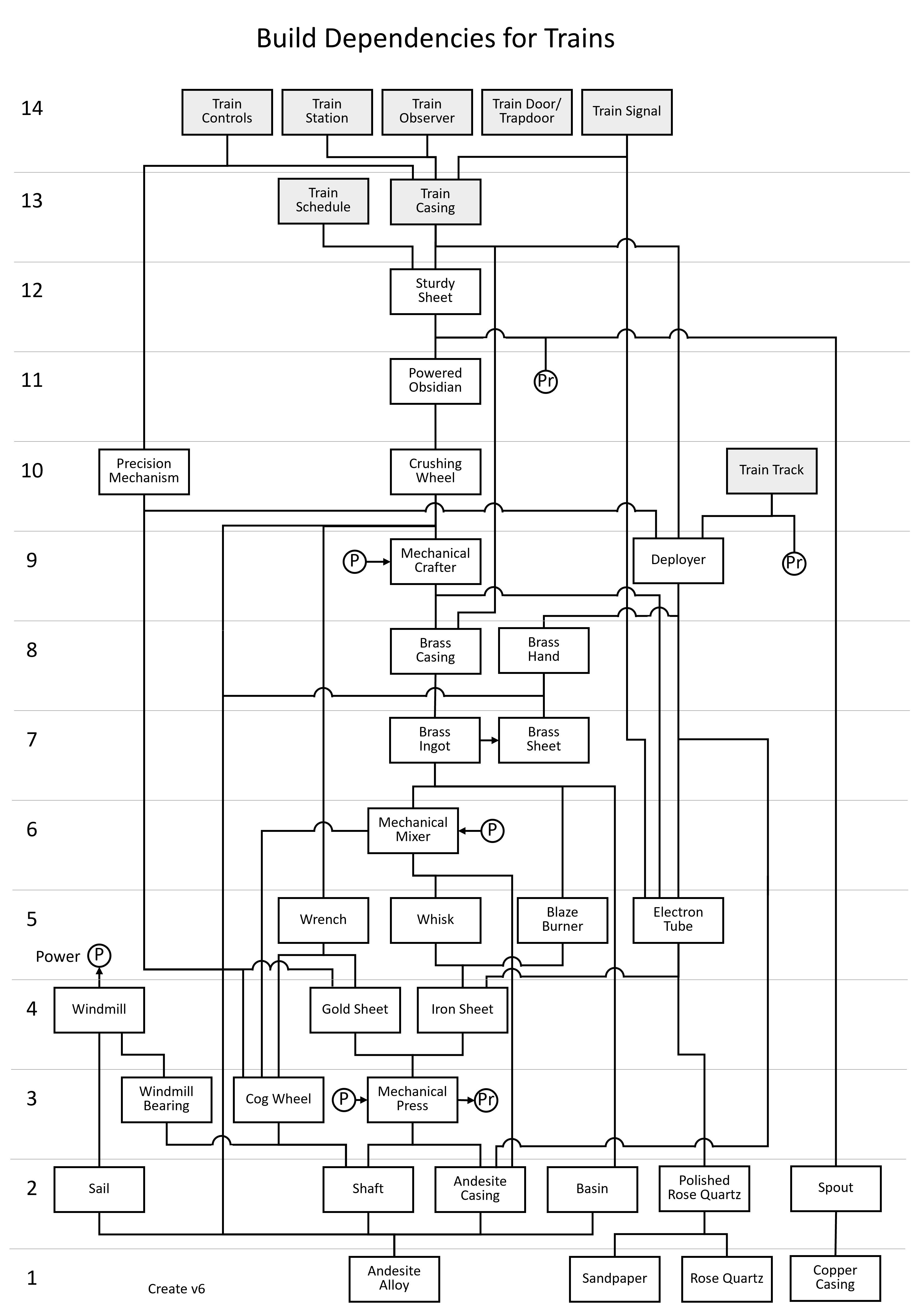 The image labeled "Build Dependencies for Trains" shows the train components, the Create items they depend on and the order of build for those items. A full list of build dependencies can be found on the Build Order page.