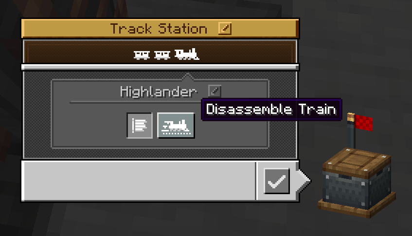 Right click the Train Controls to take control of the Train. The player's ordinary movement options will affect the Train instead. Hold the forward and the right or left movement keys to turn off on a branching track. Hold jump when approaching a Station to properly align the Train. Use the scroll wheel to adjust the maximum speed. Right-click the Train Controls again or sneak to stop controlling the Train. If a Steam Whistle is attached, hold sprint to activate it.